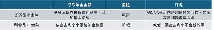 年金險的商品類型包含投資型年金險、利變型年金險等,投資型年金主要是將標的連結到「基金或債券」,透過躉繳或分期繳來累積帳戶的資產,可以透過「投資標的」賺取更多的帳戶價值以利年金總額的累積,但同時也有著較其他年金險更高的風險,因為投資是有賺有賠的。